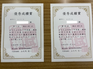 冬期講習の頑張りが過去最高の形となったことを嬉しく思います。2名ともそれぞれの中学校で統一模試受験者の中で1位を獲得しております。よく頑張りました!この流れで私立校,公立校受験へと自信を持って臨んでくれると思います。